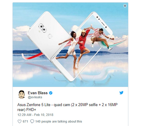 Hội nghị di động toàn cầu MWC 2018 sắp diễn ra, đã có rất nhiều hãng sản xuất điện thoại công bố sẽ góp mặt siêu phẩm mới nhất của mình tại đây. Thông tin tiếp theo liên quan tới mô hình Asus Zenfone 5 Lite. Mô hình này có thể được công bố cùng điện thoại Zenfone 5.