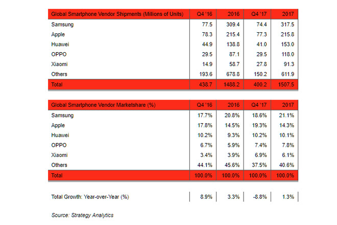 Theo hãng nghiên cứu Strategy Analytics, so với quý 4 năm 2016, tổng số lô hàng bán ra trong quý 4 năm 2017 vừa qua đã giảm 9% và đây là "mức sụt giảm lớn nhất trong lịch sử ngành điện thoại thông minh." Vậy đâu là nguyên nhân của tình trạng này?