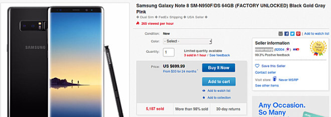 Giá niêm yết của Samsung Galaxy Note8 ở thị trường nước ngoài sau một thời gian giảm xuống còn 790 USD, sau đấy là 740 USD, và giờ đây đang hạ xuống mức rất thấp tới 699,99 USD, tức là hạ hơn 90 USD (hơn 2 triệu VNĐ). Theo nhà bán lẻ Top Rated Plus eBay thì mức giá này được áp dụng cho phiên bản Note8 có dung lượng bộ nhớ 64GB.