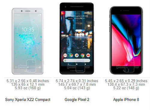| Sony Xperia XZ2 Compact | Google Pixel 2 | Apple iPhone 8 | |